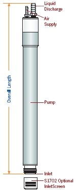 The Eliminator™ is a high capacity bladder pump designed for LNAPL and DNAPL. It’s also used to handle viscous contaminants, such as crude oil. How it works: When the bladder is squeezed from the outside by the compressed air, fluid within the bladder is forced out through a check valve at the top of the pump. Then, when the air pressure around the bladder is exhausted, the bladder expands, resuming its original shape. This pulls fluid into the bladder through either the top or bottom inlet, depending on the pump inlet configuration.